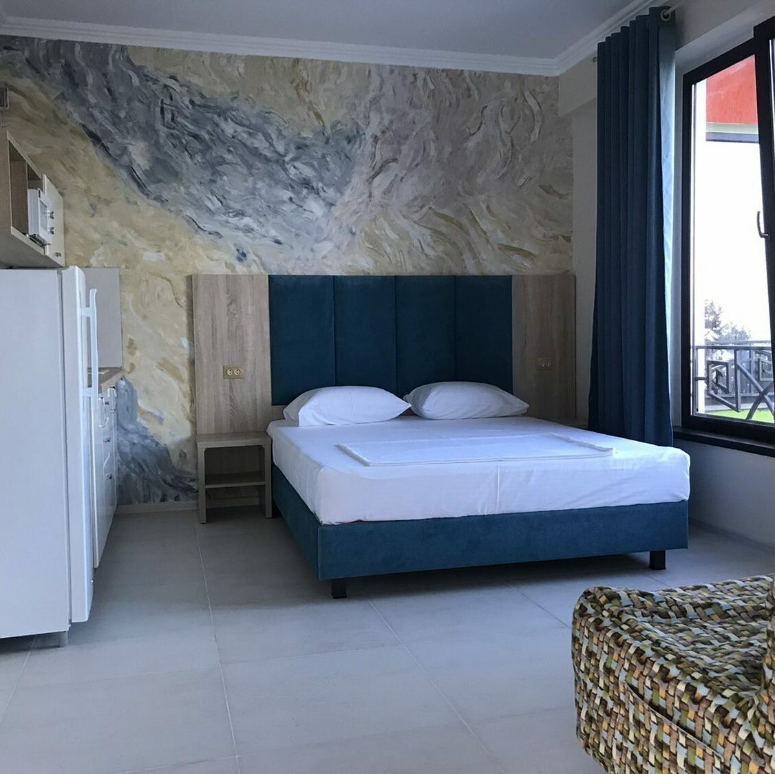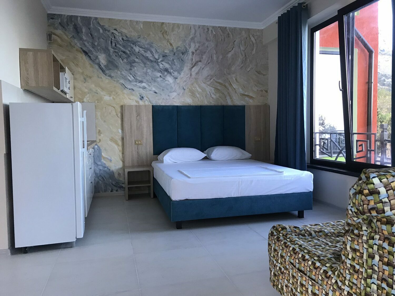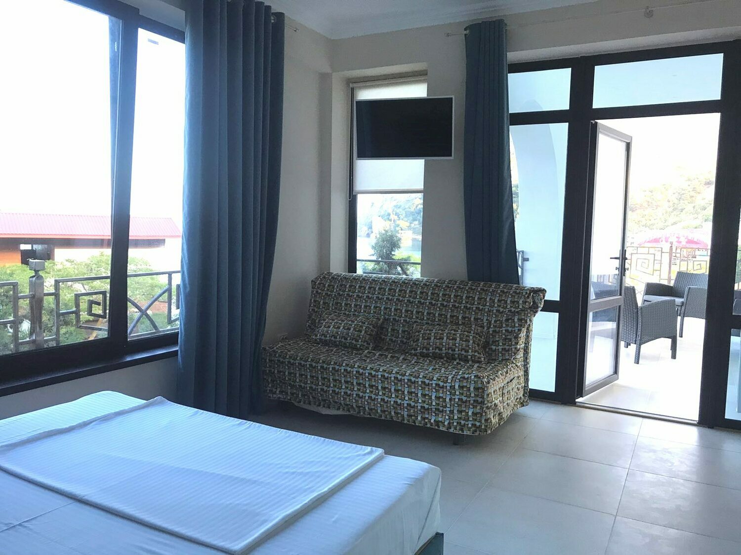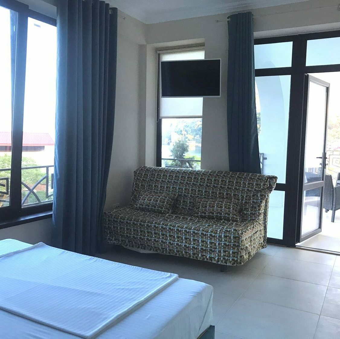 Современный просторный и уютный номер с потрясающим видом на море, горы и Зеленую бухту Нового Света. Большой балкон (14 кв.м.) с комфортабельными креслами и диваном.