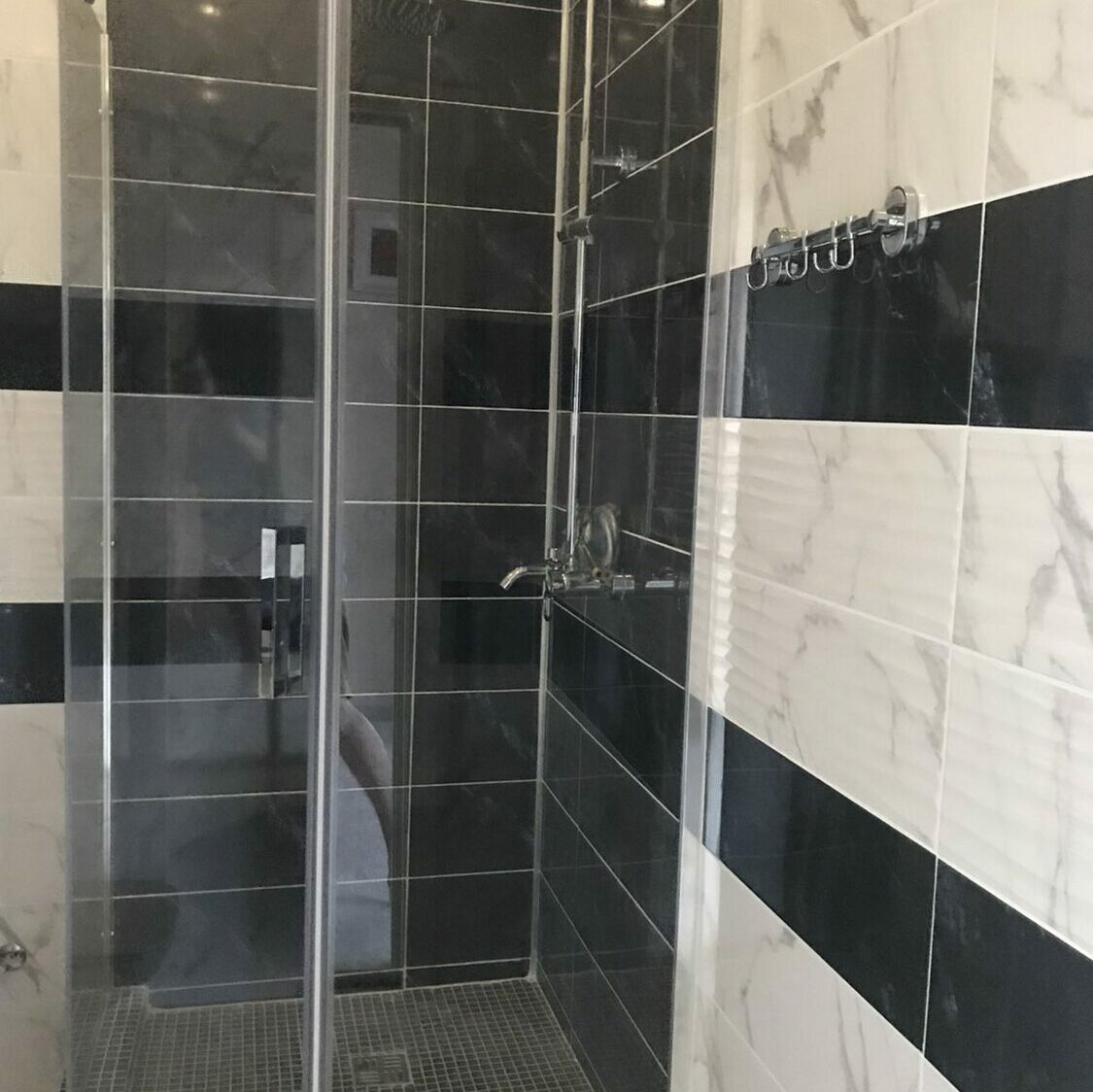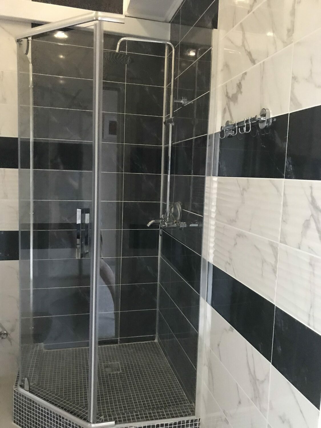 Ванная комната: душевая кабина, умывальник, санузел, фен, тапочки, набор полотенец, туалетные принадлежности.
